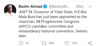 An nada gwamnan jihar Yobe da ke arewa maso gabashin Najeriya Mai Mala Buni shugaban kwamitin riko na jam'iyyar APC.